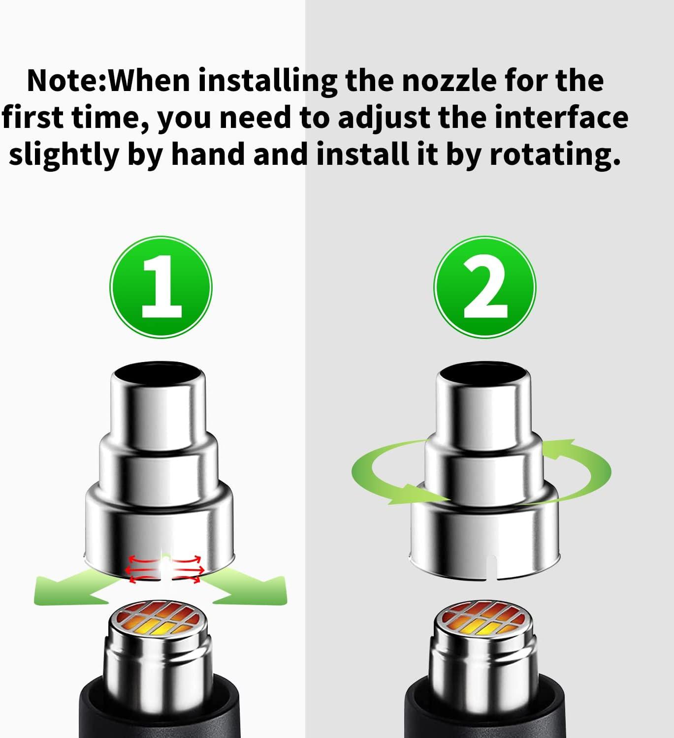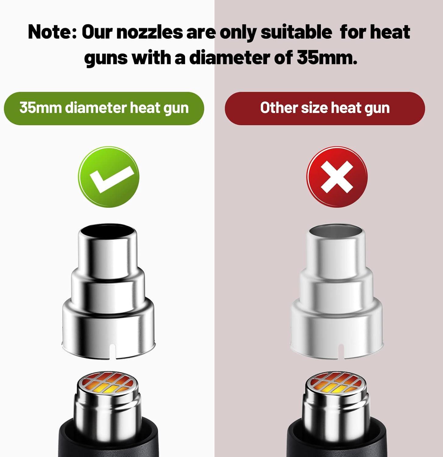 【Conventional Size, Suitable for 35MM daimeter heat gun nozzle】SEEKONE heat gun nozzles diameter is 1.377inch/35mm, can be used for SEEKONE heat gun. It's better to measure the size before purchasing. When installing the nozzle, you need to rotate it, not directly insert it