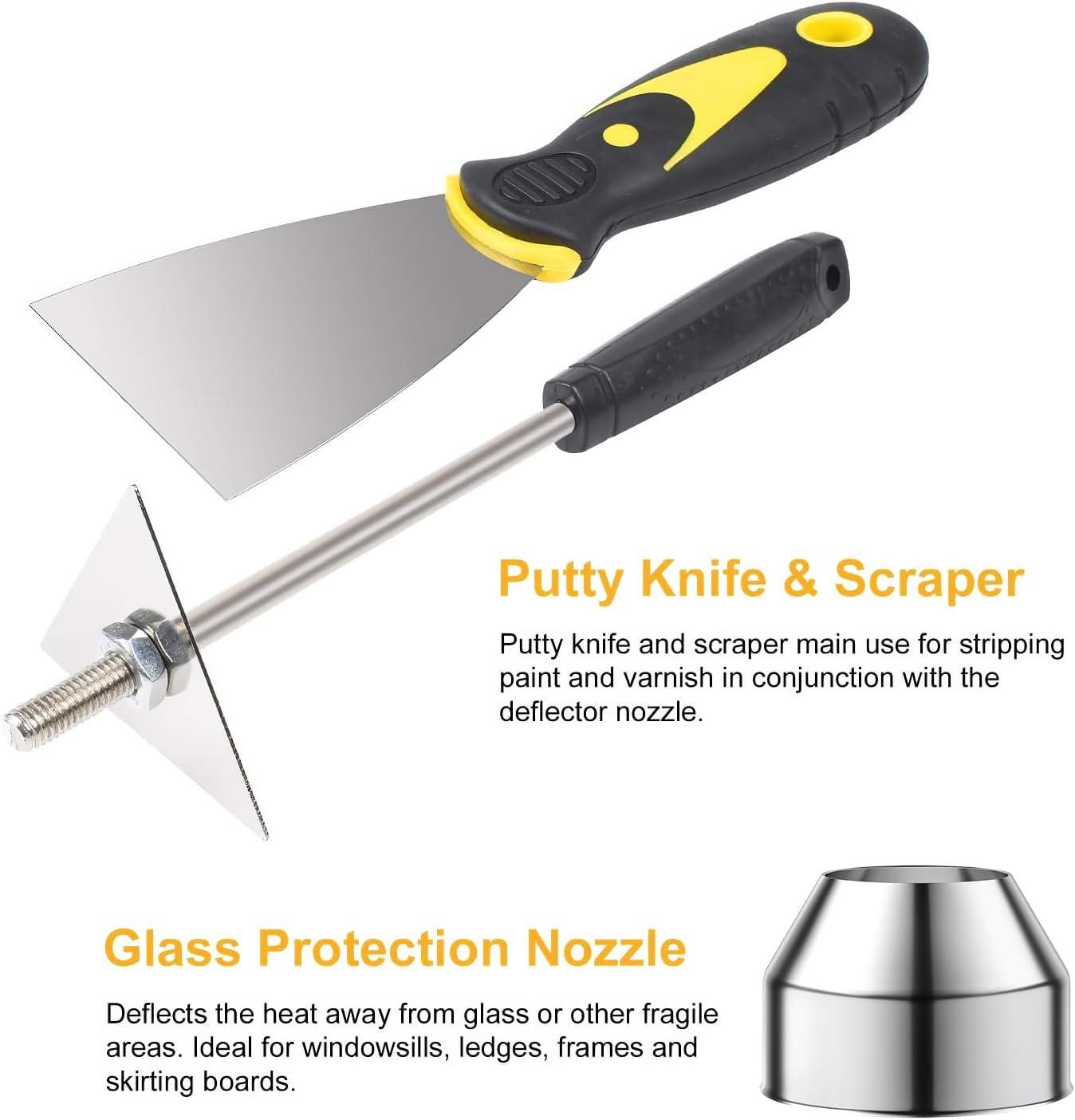 【Versatile Accessories】5 Nozzles, paint scraper & putty knife extend the heat gun's utility. A range of nozzles and scrapers performs wide applications flexible