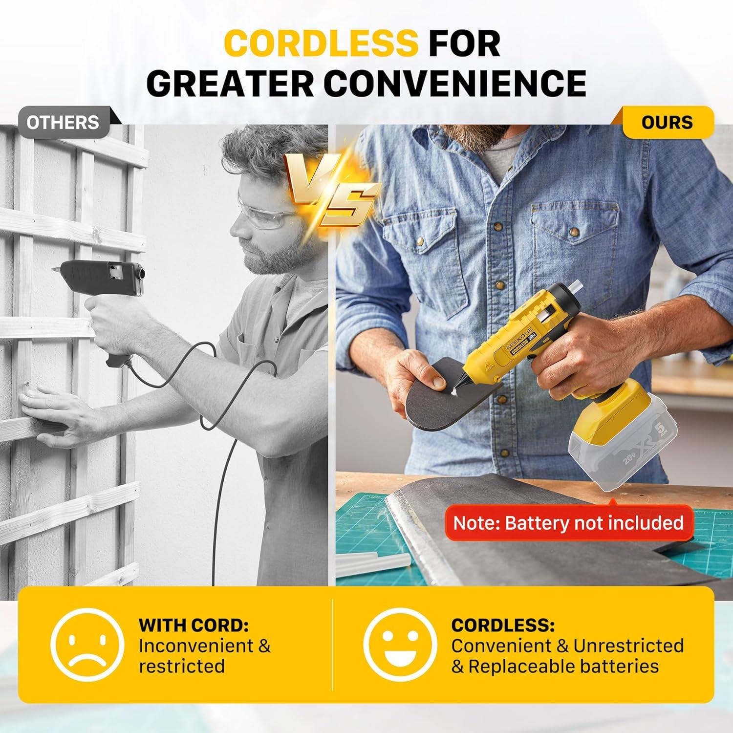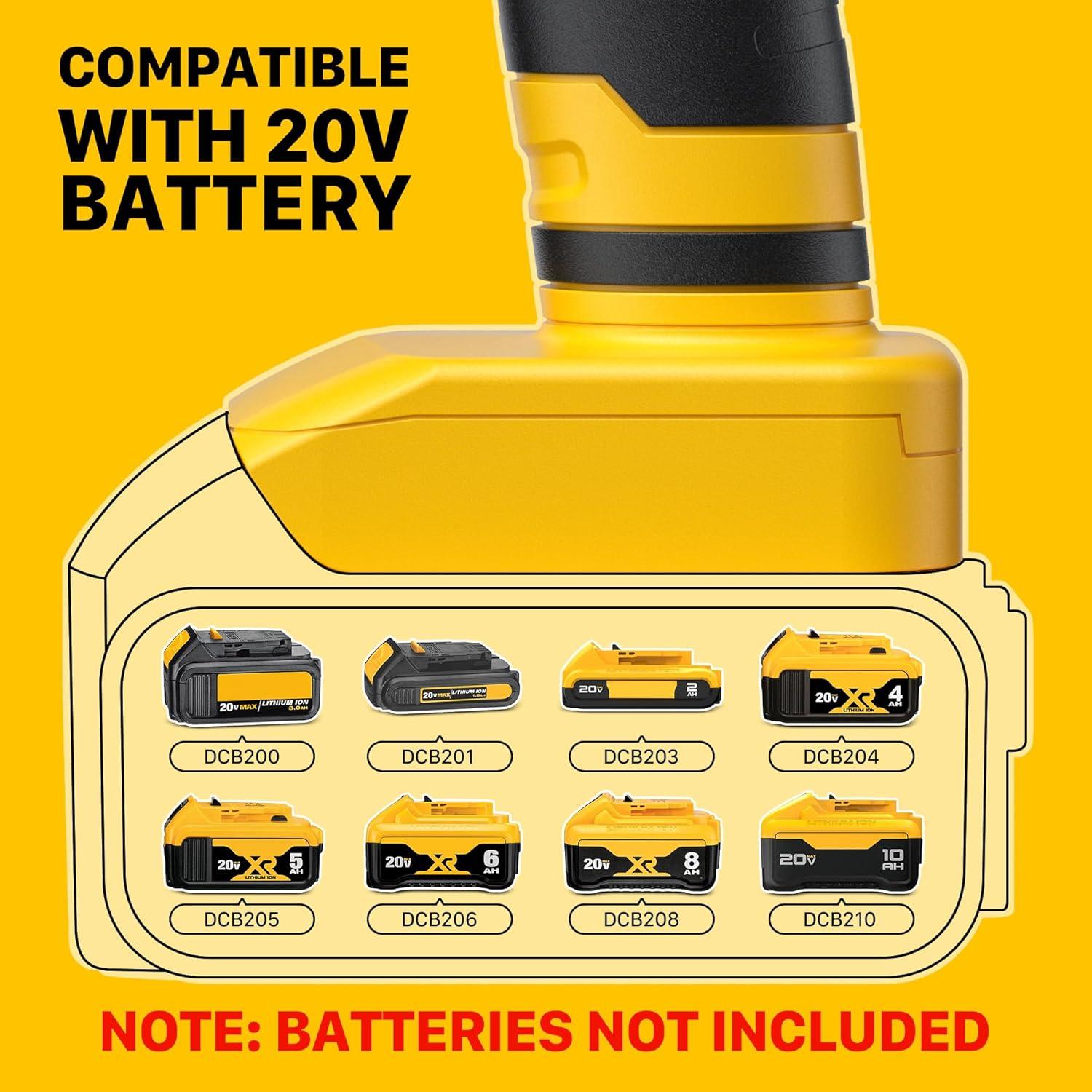 【Compatible with Dewalt 20V Battery】 **Please note**: Battery is NOT included, and will need to be purchased separately or have a battery converter. This cordless glue gun is compatible with Dewalt 20V Lithium-ion batteries. 20V Batteries: DCB200, DCB201, DCB203, DCB204, DCB205, DCB206, DCB208, DCB210
