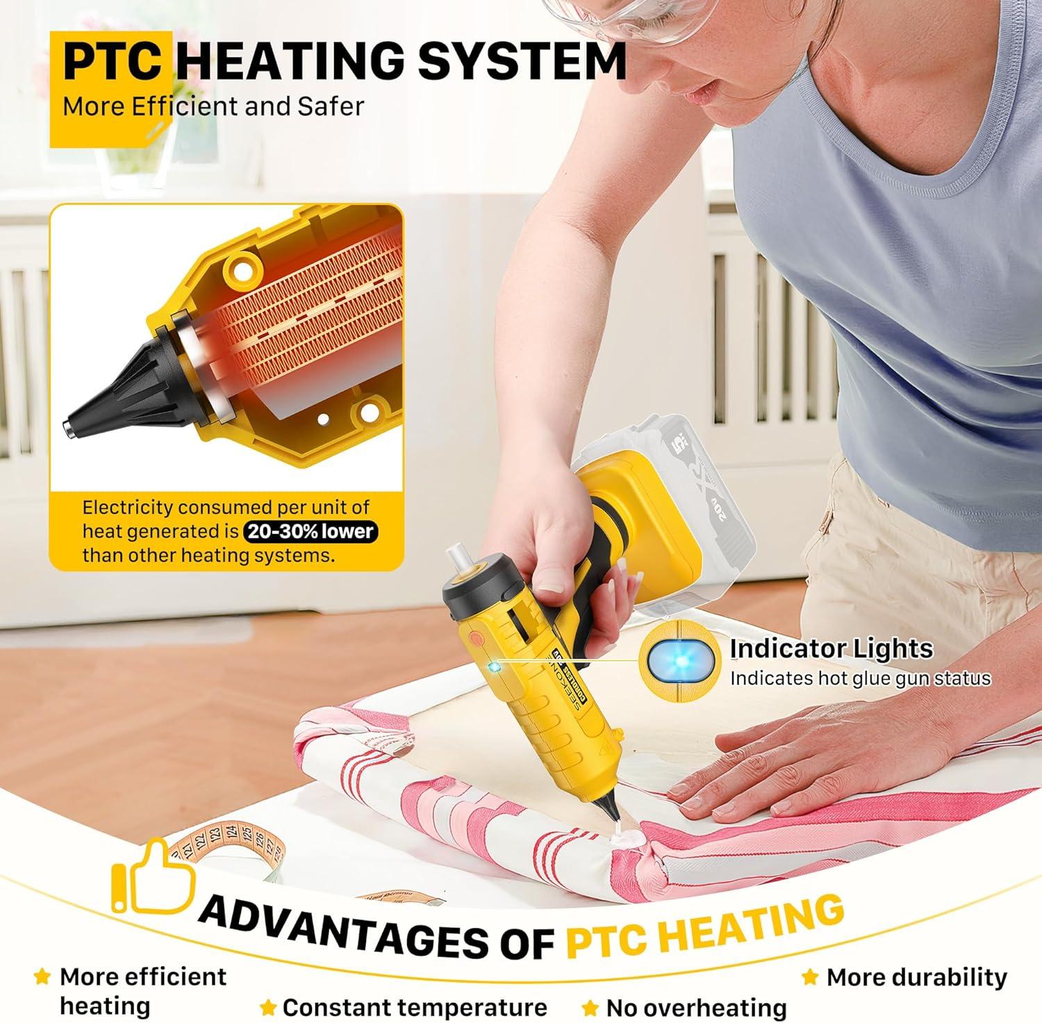 【Fast Preheating & Rapid Gluing speed】 The 100W cordless hot glue gun features an advanced PTC heating system that quickly warms up to 190℃/374°F in just 1-2 minutes, ensuring a smooth and even flow of glue. Its unique insulated nozzle has an anti-dripping design, which effectively reduces glue overflow. It can not only save glue sticks but also keep the workspace clean