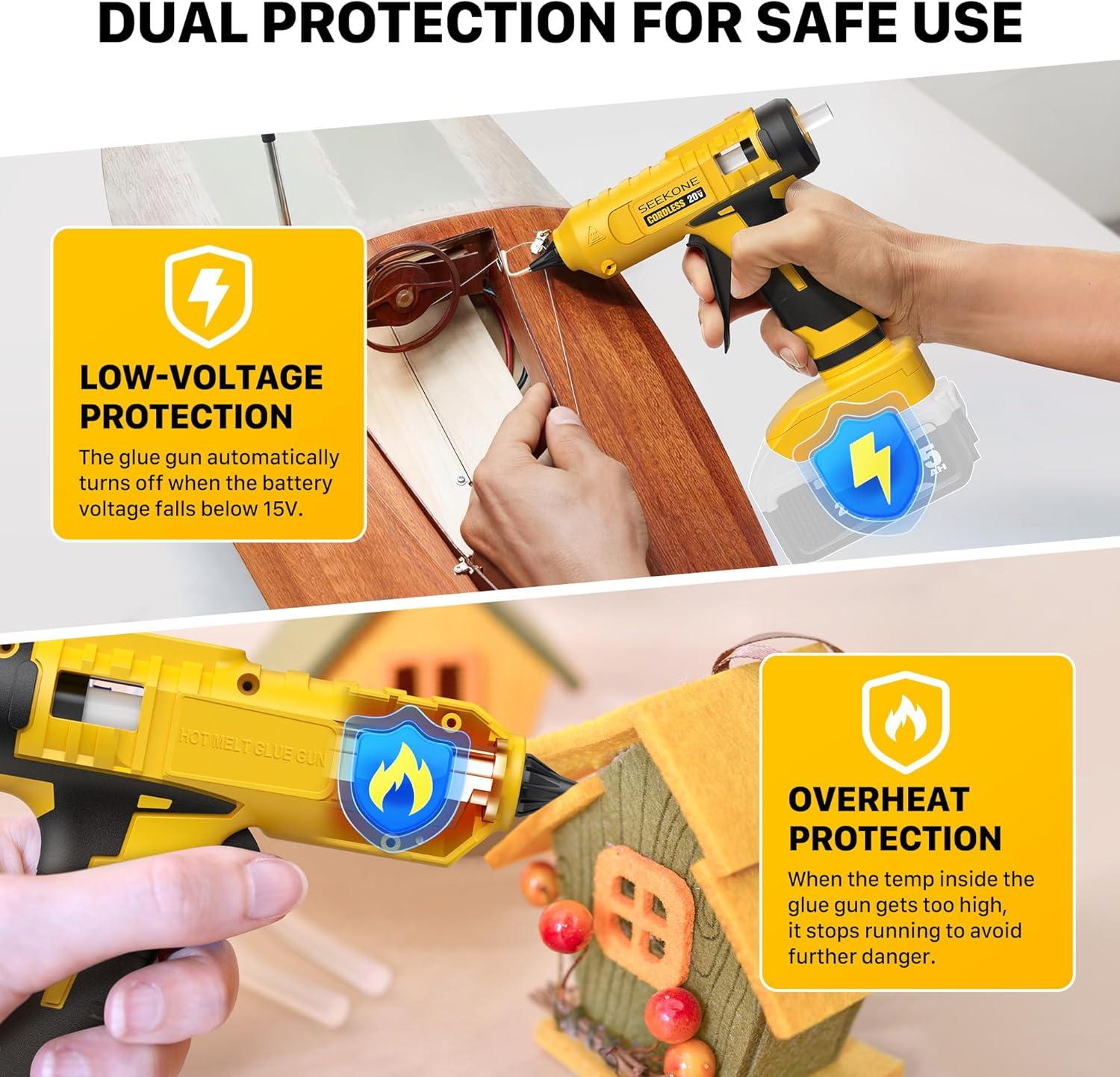 【Comprehensive Safety & Security】 This cordless hot melt glue gun has a built-in low voltage protection device that automatically shuts down when the battery voltage drops below 15V. The overheat protection monitors the temperature inside the glue gun and stops the motor once it gets too high, prolonging battery life and ensuring safe use. Moreover, PA6+30%GF Material and insulated case prevents burns during operation
